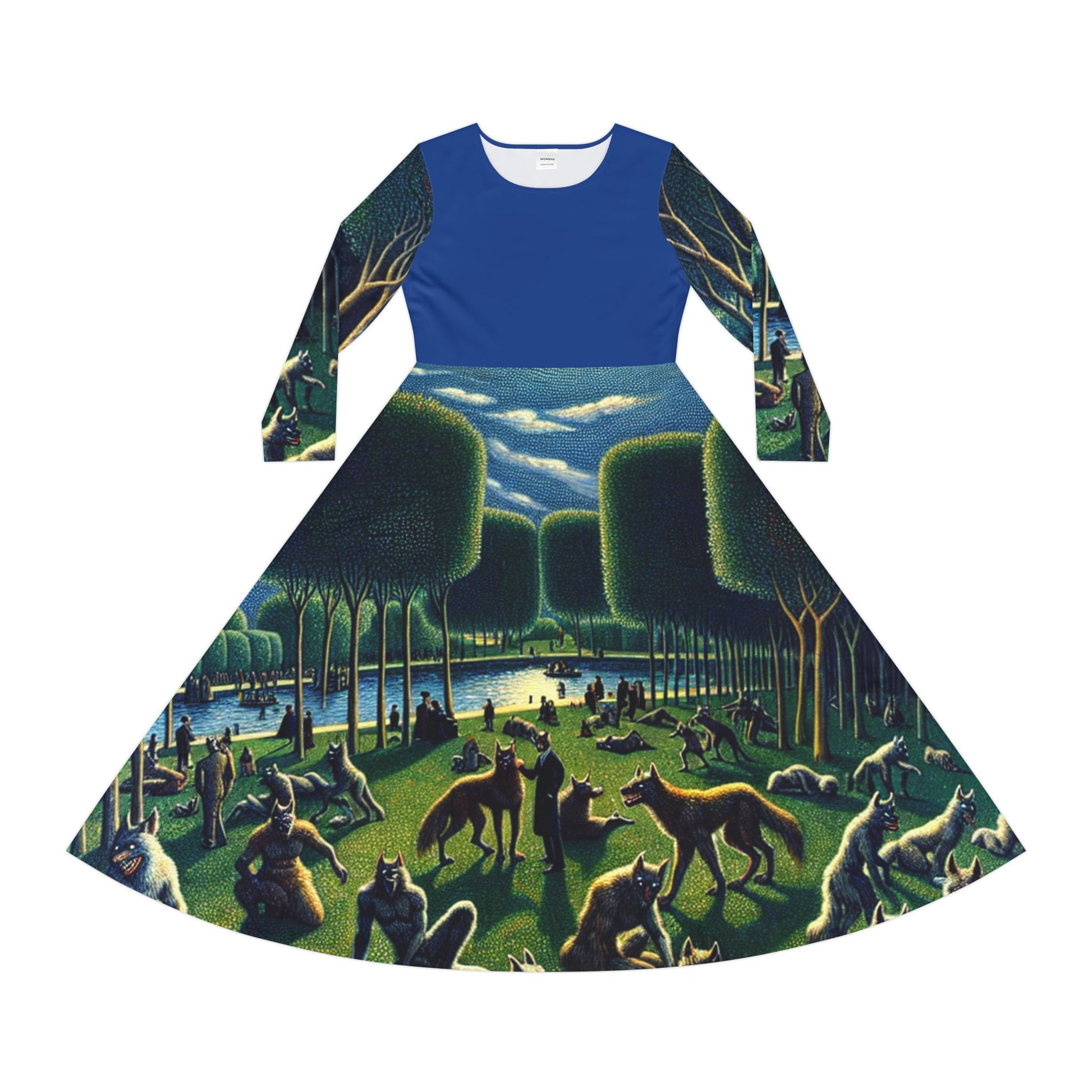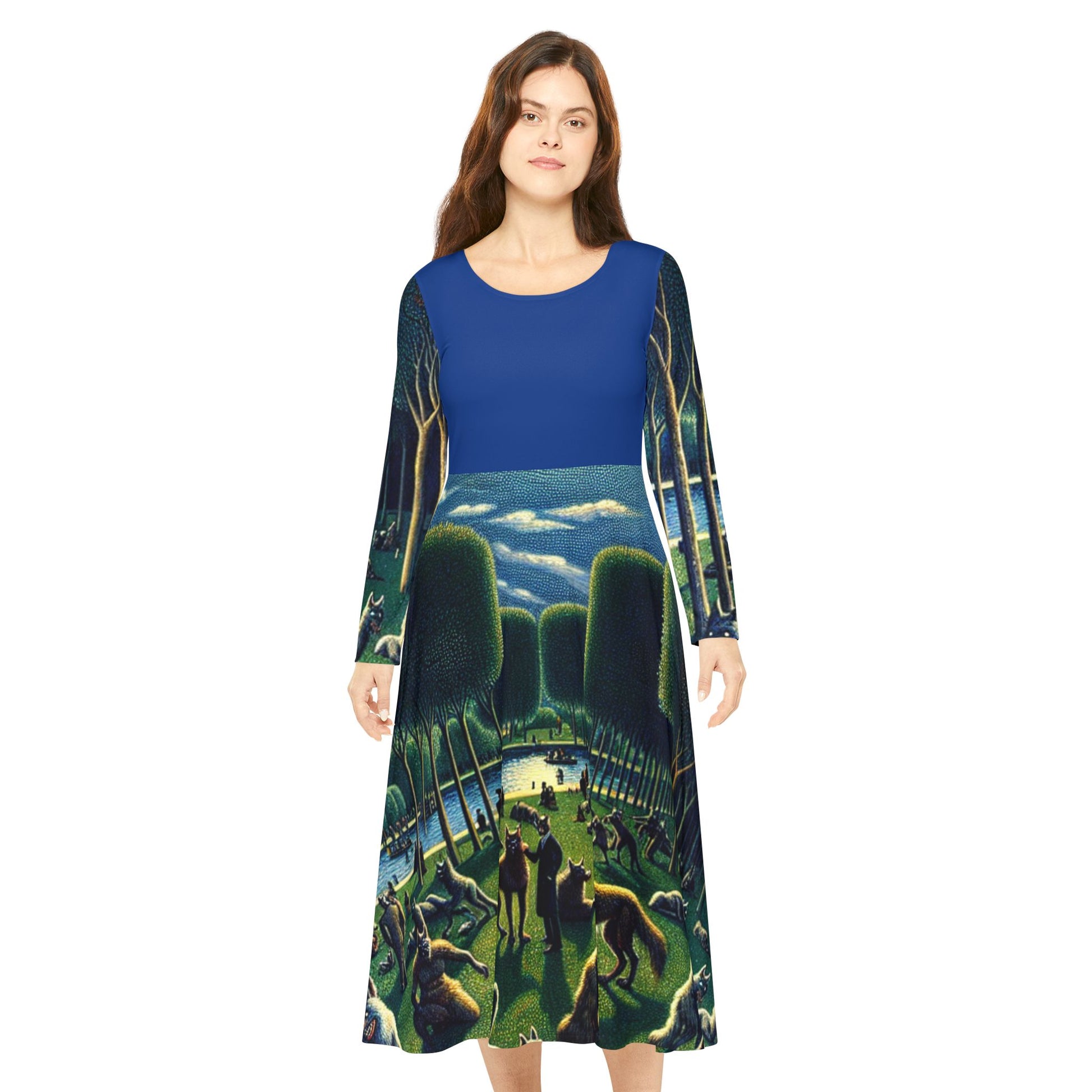 Step into a scene that feels like a memory from a dream. This long-sleeve dress unfolds like a wandering through a sunlit hall of marble statues and winged creatures — soft shafts of light, gentle motion, and a calm hush of wonder. The high scoop neckline and flowing skirt let the artwork breathe; each turn reveals more of the painted procession. Wear it to conjure quiet awe at gallery openings, twilight gatherings, or evenings when you want your outfit to tell a story. The regular fit and durable polyester keep the colors vivid and the silhouette easy to move in, so the dress feels both wearable and transportive.